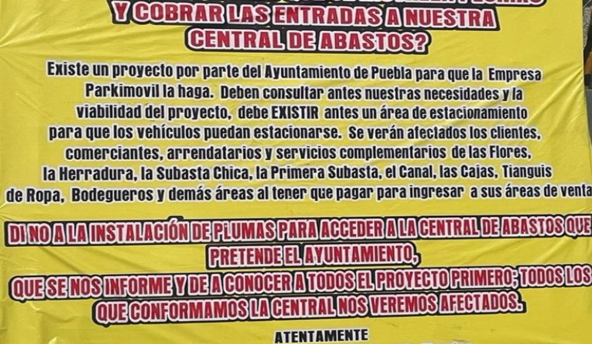 Comerciantes de la Central de Abasto colocaron lonas en los accesos de este lugar en donde manifiestan que el ayuntamiento pretende implementar los parquímetros o estacionamientos rotativos, por lo que solicitaron que se les informe sobre el proyecto.