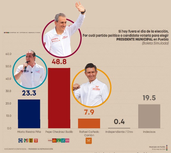 De acuerdo con la encuesta municipal de Puebla levantada por el Centro de Estudios Consultivos, entre el 20 y el 24 de mayo, el abanderado de la coalición Sigamos Haciendo Historia, José Chedraui, tiene el 48.8 por ciento de las preferencias electorales.