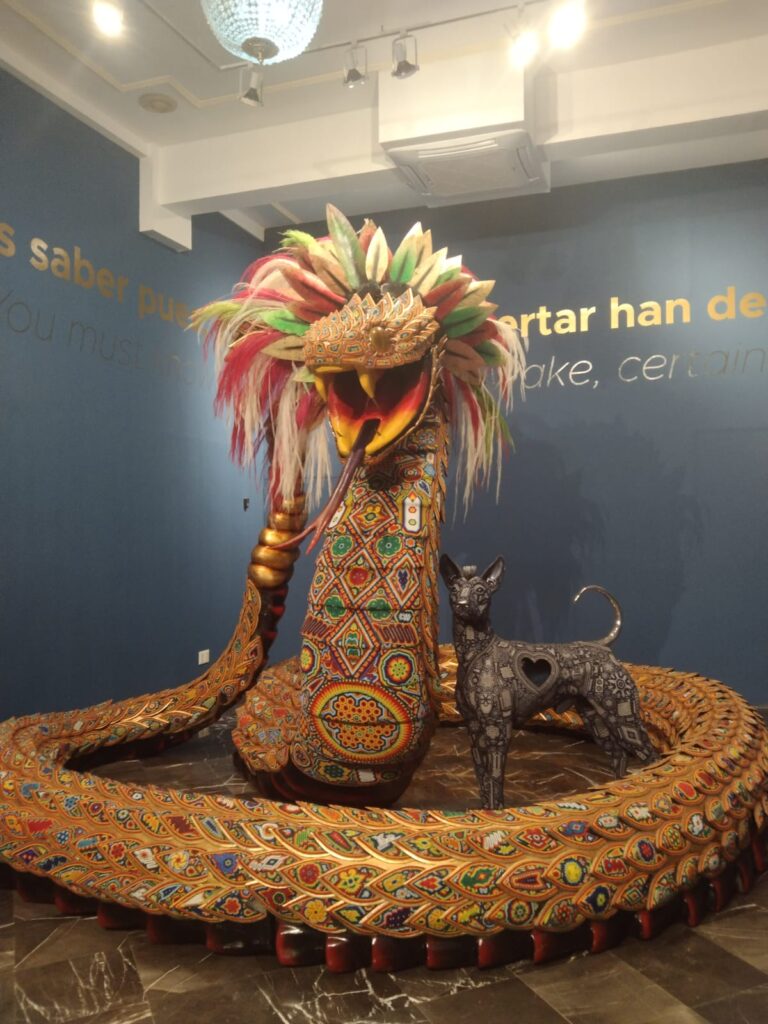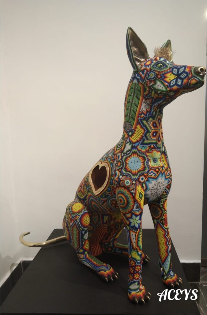 El arte Wixarika que es el que se utiliza en esta esculturas, es un arte que consiste en el pegado de chaquira con símbolos como: El Peyote, Maíz, Fuego, Sol, Serpiente. Sus significados son: