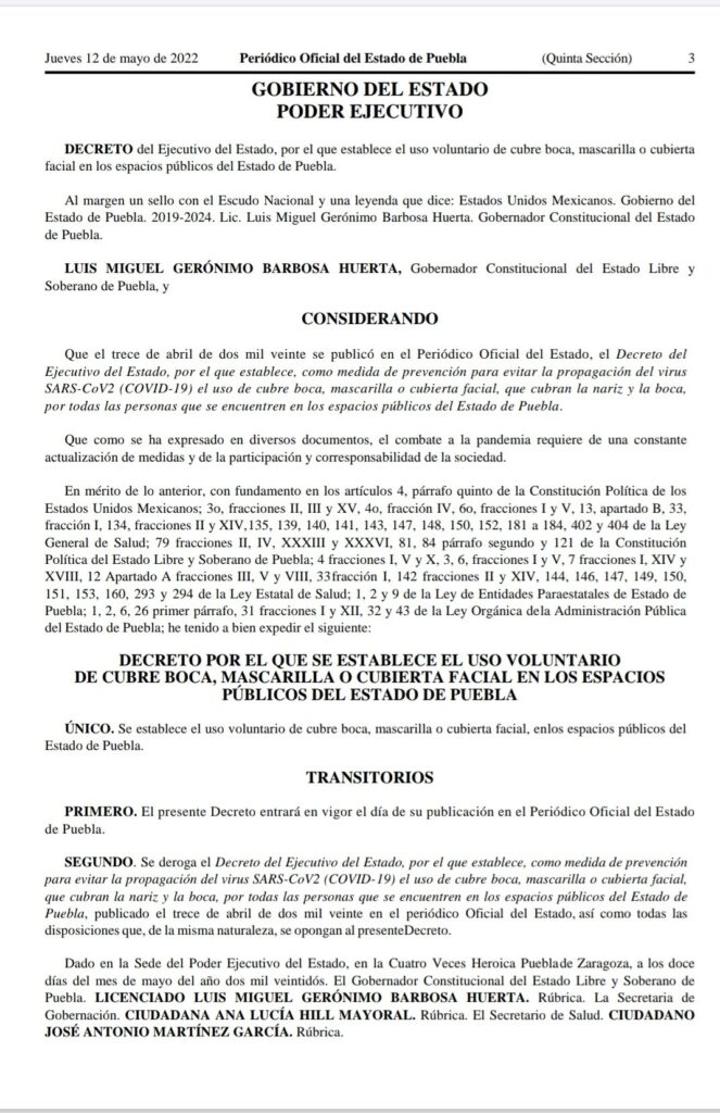 Horas después dicho decreto se publicó en el Periódico Oficial del Estado de Puebla, el cual deroga el publicado el pasado 13 de abril del 2020, en el que se establecía su uso obligatorio como medida de prevención para evitar la propagación del virus.