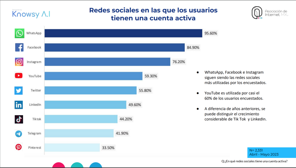 Con relación al uso de redes sociales, podemos ver en esta gráfica que de esos 96.87 millones de personas que están conectadas a internet, un 95.6% de ellas usa regularmente Whats app, el servicio de mensajería que es usado masivamente por todo mundo. Tan así, que el uso de correo electrónico ha decaído dramáticamente, lo cuál no significa que Whats app sea más eficiente para todos los usos que le damos, que otras herramientas, incluido el correo electrónico, pero la convención de transmitir archivos, imágenes, crear grupos, ha hecho de esta la herramienta campeona hoy en día. Le siguen Facebook e Instagram, lo que asegura a una sola compañía (Meta), el control en las redes sociales a las que accedemos las personas, ya que tiene el control de estas tres plataformas. Después aparece Youtube, de Google, Twitter (X) de Elon Musk, la china Tik Tok, Telegram y Pinterest. Pero por los números, podemos tener la seguridad de que estamos conectados de forma ininterrumpida con las redes sociales. A esto habría que segmentar por grupos de edad el acceso a redes sociales, donde más allá de Whats app, que intuyo que todos los grupos sociales la usan por igual, las demás se han ido enfocando a grupos sociales más específicos. Existen también plataformas que son competencia a Whats app, como Telegram o Signal, pero ciertamente tienden a ser marginales, al menos para el caso de México (En Estados Unidos la herramienta de Mensajería de Facebook es más popular que Whats app). Pero Facebook, se ha convertido en la red por excelencia para personas de mayor edad; los jóvenes prefieren Instagram o Tik Tok; para discusiones políticas y de todo tipo está Twitter (hoy X), y Linkedin para el sector profesional y de negocios.