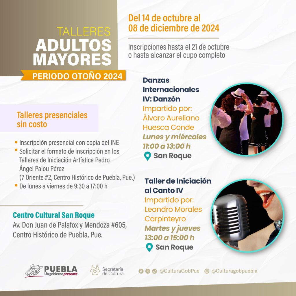 Dichos cursos serán impartidos durante el periodo de otoño, comprendido entre octubre y diciembre del presente año. Los detalles de fechas, horarios, edades, modalidad, costos (en caso de que aplique) y talleristas pueden consultarse en las redes sociales Facebook “Secretaría de Cultura Puebla” y X “@CulturaGobPue”, así como en la página web sc.puebla.gob.mx.