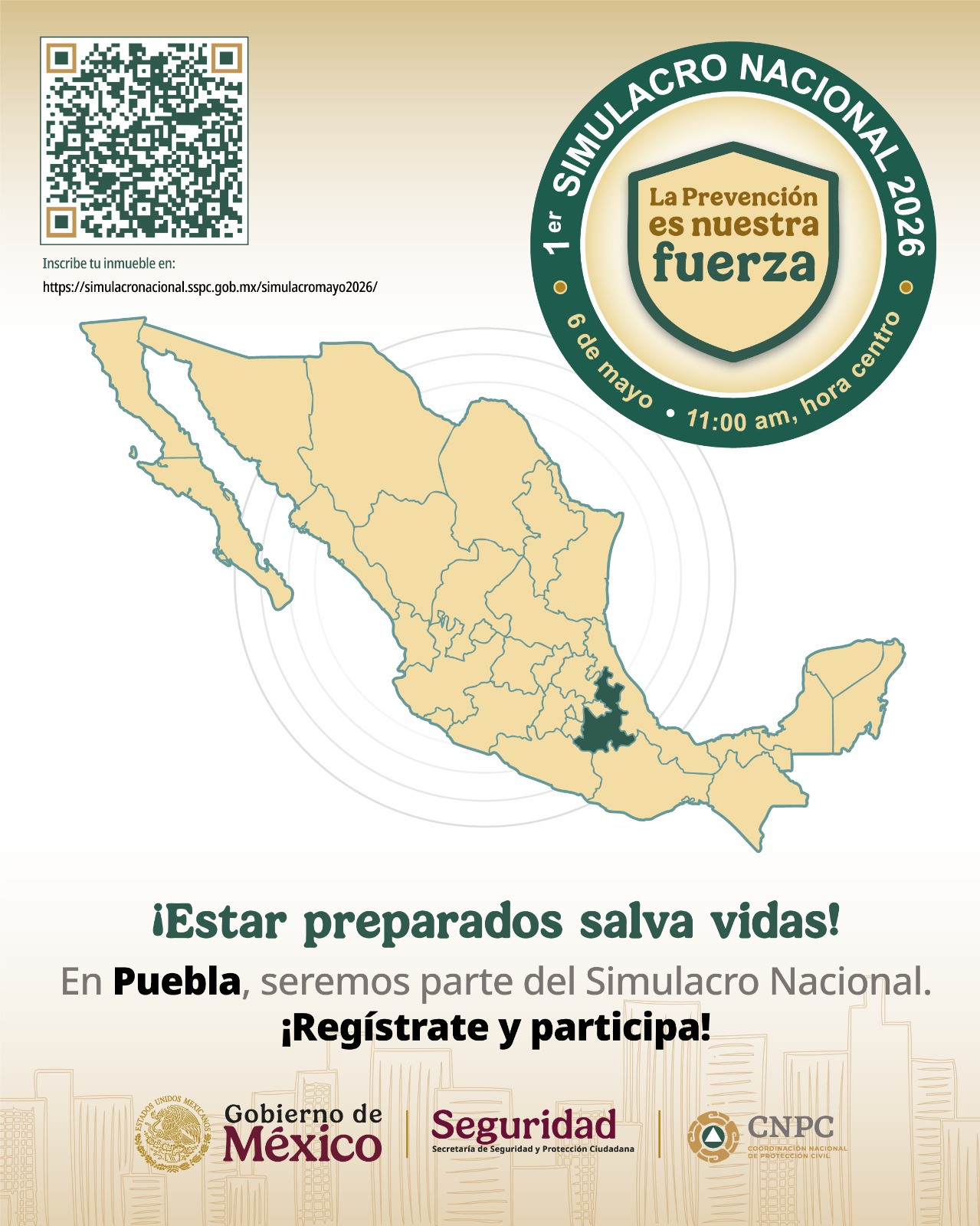 Para fortalecer la cultura de la prevención y la capacidad de reacción de la población ante una emergencia, el Gobierno de Puebla a través de la Coordinación General de Protección Civil, invita a la ciudadanía a sumarse al Primer Simulacro Nacional 2026, que se llevará a cabo el próximo 6 de mayo a las 11:00 horas.