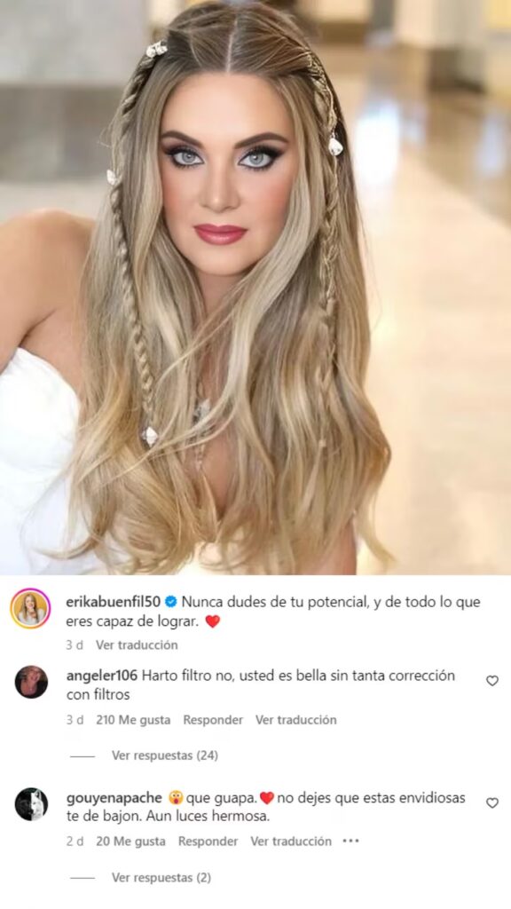 No obstante, la fotografía no fue interpretada como un ejercicio de ocio y un amplio grupo de usuarios de Instagram acusó a la actriz de no asumir su edad. “Erika Buenfiltro”; “Harto filtro no, usted es bella sin tanta corrección con filtros”; “Ni se parece a ella”; “Un filtro más y se convierte en el curioso caso de Erika Button!”; “Ni cuando actuó en Marisol, sé veía tan joven”; “La reina del tik tok y la reina de los filtros”, son solo algunos comentarios que ilustran la controversia a la que dio pie la imagen.
