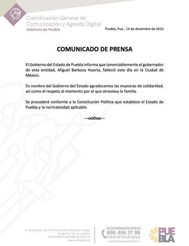 Falleció el gobernador Miguel Barbosa Huerta.