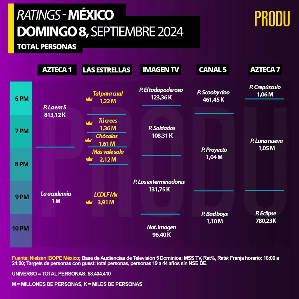 Ahora bien, a pesar de registrar una notable perdida de audiencia, aún así la programación de “La Casa de los Famosos 2024” sigue colocándose como el contenido más consumido por los televidentes, dejando entre los últimos lugares al programa de la competencia: “La Academia” con 1 millón en rating, el cual también ocupa el horario estelar de los domingos.