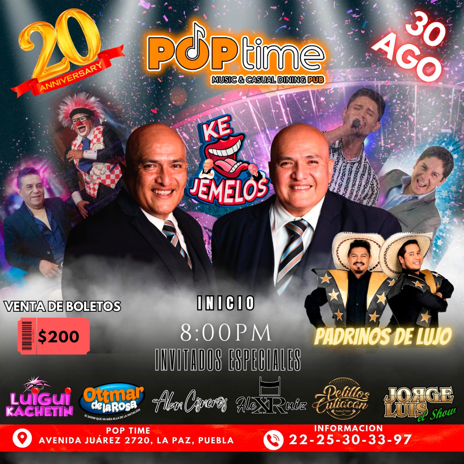Moy y Beny los «KE JEMELOS» los invita a ser parte de su profesionalismo para festejar su 20 Aniversario que se llevara a cabo en el «POP TIME» ubicado en Avenida Juárez #2720 colonia La Paz de la ciudad de Puebla, este próximo 30 de agosto a partir de las 8:00 pm con un costo de recuperación de $200 pesos mexicanos.