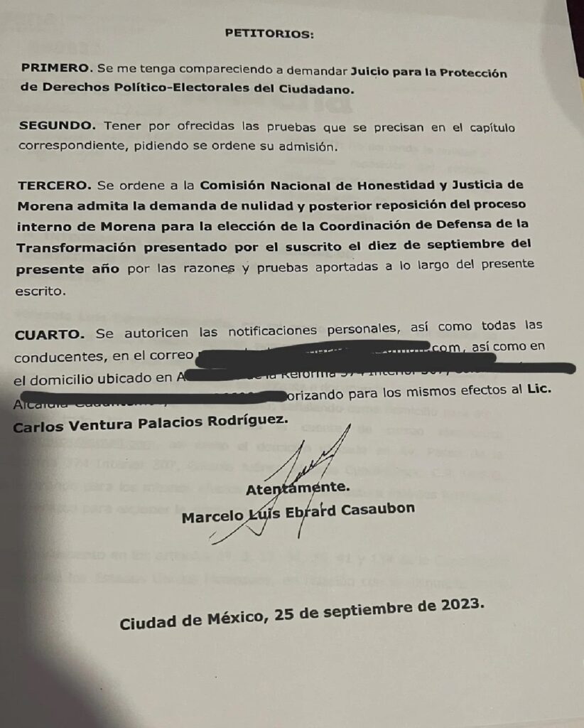 Marcelo Ebrard presenta juicio contra Morena en la Sala Superior del TEPJF para que admitan su impugnación