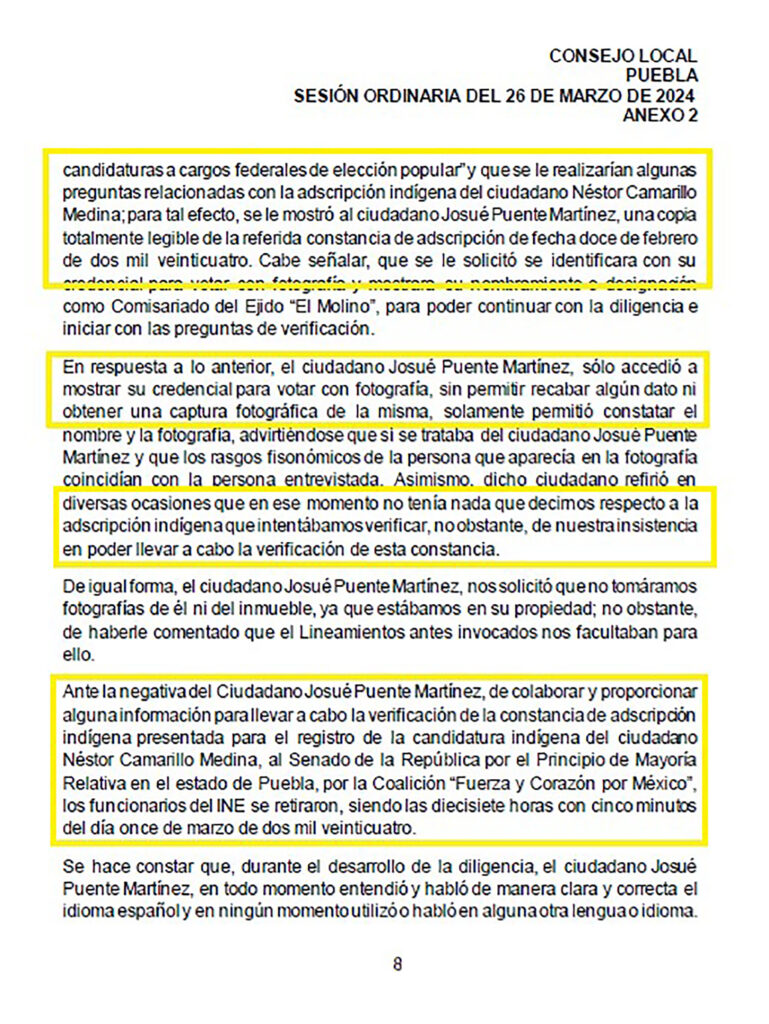 La dirigencia del Movimiento de Regeneración Nacional (Morena) advirtió un posible fraude en la entrega de constancias de adscripción indígena por parte del comisariado ejidal de El Molino, en Zacapoaxtla, debido a la entrega de esta documentación a Néstor Camarillo Medina y más candidatos priistas para ocupar espacios de elección popular como acciones afirmativas en favor de este grupo vulnerable.