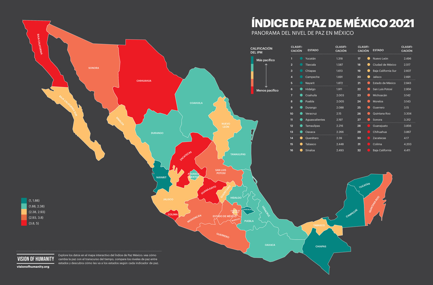 De los 32 estados, 23 incrementaron sus niveles de paz en 2021, mientras que nueve se deterioraron. Aunque la mayoría de los estados mejoraron, el aumento en paz nacional fue marginal, mostrando que el deterioro en una minoría de estados impulsa los altos niveles de violencia en el país.