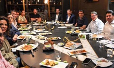 El gobernador Sergio Salomón Céspedes Peregrina, el precandidato único a la gubernatura por la coalición Sigamos Haciendo Historia, Alejandro Armenta Mier, y los aspirantes a la...